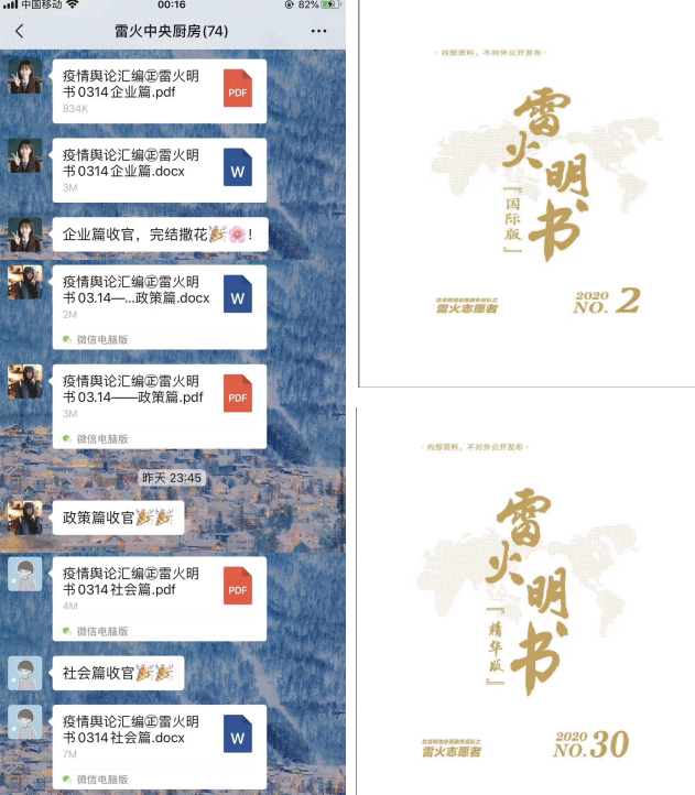”应收尽收“工作落实后,国内疫情得到了明显的控制,雷火救援、雷火研究的工作量已经不似团队成立之初。近来网络求助信息收集数量多日为零。以”雷火志愿者“署名的《雷火明书:疫情舆论汇编》电子书也拟于3月下旬由清华大学出版社集结出版。