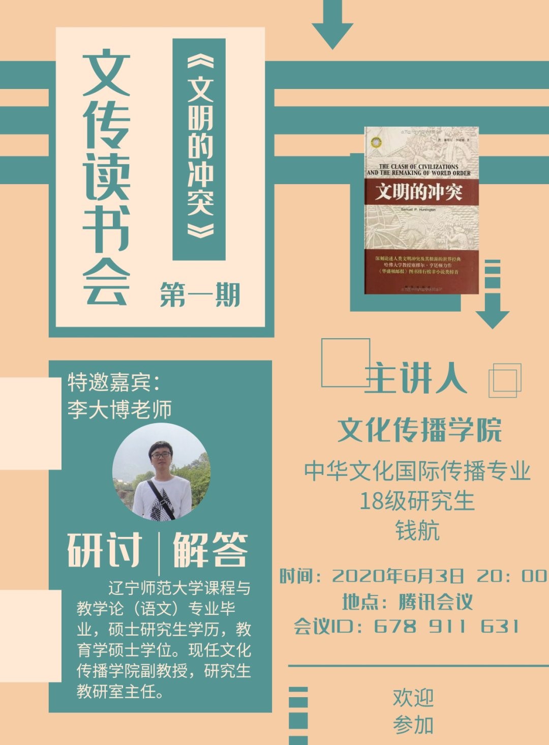 副教授、研究生教研室主任李大博为首期特邀嘉宾,院长张恒军教授、芦思宏老师、辅导员王琳老师出席会议。会议由2018级研究生王立倩主持,2018级研究生钱航担任主讲人。2018级研究生钱航首先结合自己阅读《文明的冲突与世界秩序的重建》一书的过程与大家分享于都感受。基于跨文化传播角度,他谈到西方文明(包括美国和欧洲内部)都不是匀质的,因此要针对具体国家或具体族群的特殊文化进行研究;基于中华文化的视角,他认为中国文化中儒道两家的“仁”和“自然无为”的“道”能为化解不同文明的冲突,且为“文明的共存”提供有意义的借鉴。参会的研究生汤可、乔娇、冯晓雪,主持人王立倩也都分享了自己对于本书的见解。特邀嘉宾李大博老师对本次读书会给予了充分肯定,并分享了自己的读书经验,对今后云上读书会的开展提出了宝贵建议。张恒军院长希望各位研究生能够脚踏实地深度阅读,不断拓展视野,丰富自身底蕴,鼓励同学们在所学的专业领域进行个性化的深入研究。